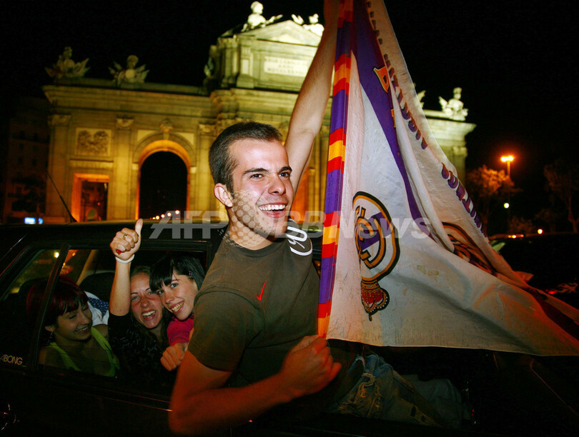 【5月5日 AFP】4日に行われたオサスナ(CA Osasuna)戦を2-1で勝利し通算31度目のリーグ優勝を飾ったレアル・マドリード(Real Madrid)のファン数千人が、チームのリーグ優勝を祝福するためマドリード(Madrid)市内のシベレス(Cibeles)広場に集まった。
