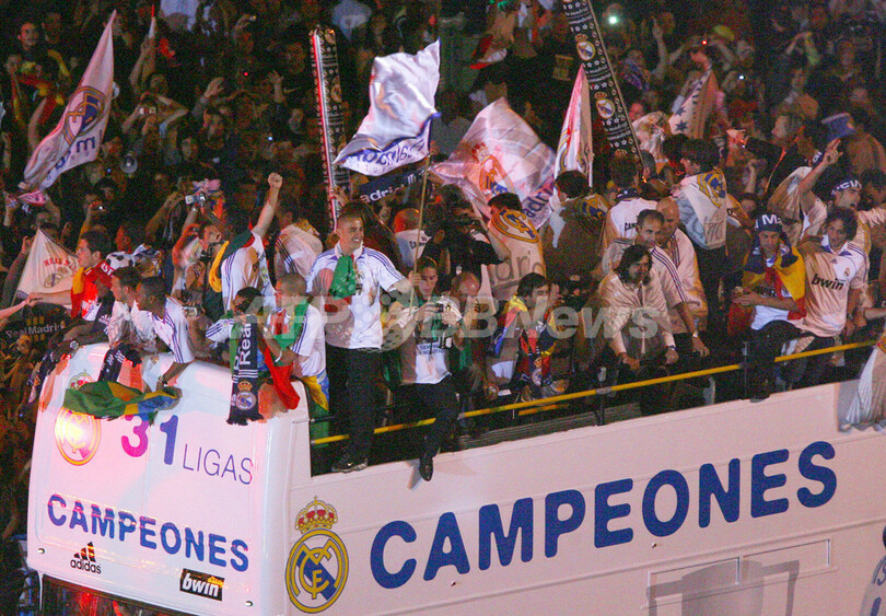 【5月5日 AFP】4日に行われたオサスナ(CA Osasuna)戦を2-1で勝利し通算31度目のリーグ優勝を飾ったレアル・マドリード(Real Madrid)のファン数千人が、チームのリーグ優勝を祝福するためマドリード(Madrid)市内のシベレス(Cibeles)広場に集まった。
