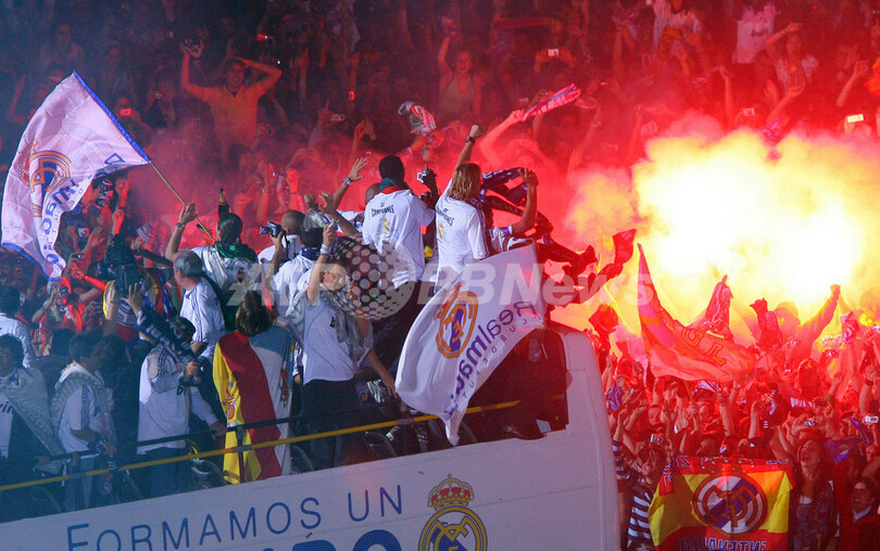 【5月5日 AFP】4日に行われたオサスナ(CA Osasuna)戦を2-1で勝利し通算31度目のリーグ優勝を飾ったレアル・マドリード(Real Madrid)のファン数千人が、チームのリーグ優勝を祝福するためマドリード(Madrid)市内のシベレス(Cibeles)広場に集まった。