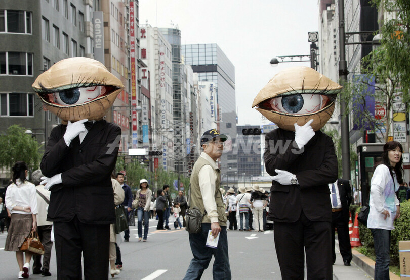 ニュース ライフ こぼれ話 GWでにぎわう銀座、大きな目玉が登場 2008年5月5日 20:01 発信地:東京 [ アジア・オセアニア 東京 ] このニュースをシェア ‹ › ❮ 9/10 ❯ 都内・銀座の大通りを歩く、巨大な目玉のかぶり物をまとったストリートパフォーマー「Medaman-Medaman」のメンバーら(2008年5月5日撮影)。(c)AFP/Yoshikazu TSUNO 画像作成中 ! 【5月5日 AFP】ゴールデンウィークでにぎわう都内の銀座で5日、大道芸やパレードなどのイベントがあり、巨大な目玉のかぶり物をまとった「Medaman-Medaman」などのストリートパフォーマーらがショッピングに訪れた人々を楽しませた。(c)AFP ライフ 一覧へ> メディア・報道関係・法人の方向け 写真・動画 購入のお問合せ>