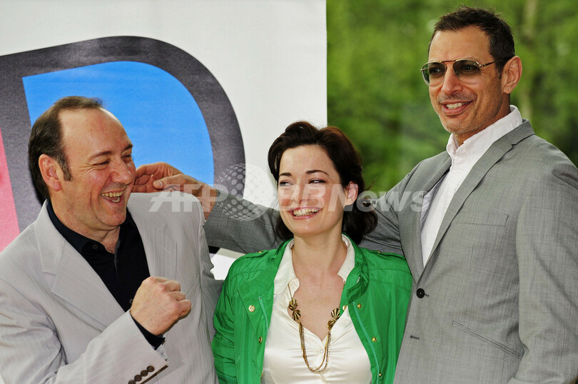 ドイツ西部の都市レックリングハウゼン(Recklinghausen)で開催中の「ルール演劇祭(Ruhrfestspiele、Ruhr theatre festival)」で行われた演劇『Speed-the-Plow』のフォトコールに登場した、出演者の(左から)米俳優ケヴィン・スペイシー(Kevin Spacey)、英女優ローラ・ミッシェル・ケリー(Laura Michelle Kelly)、米俳優ジェフ・ゴールドブラム(Jeff Goldblum、2008年5月2日撮影)。(c)AFP/DDP/CLEMENS BILAN
