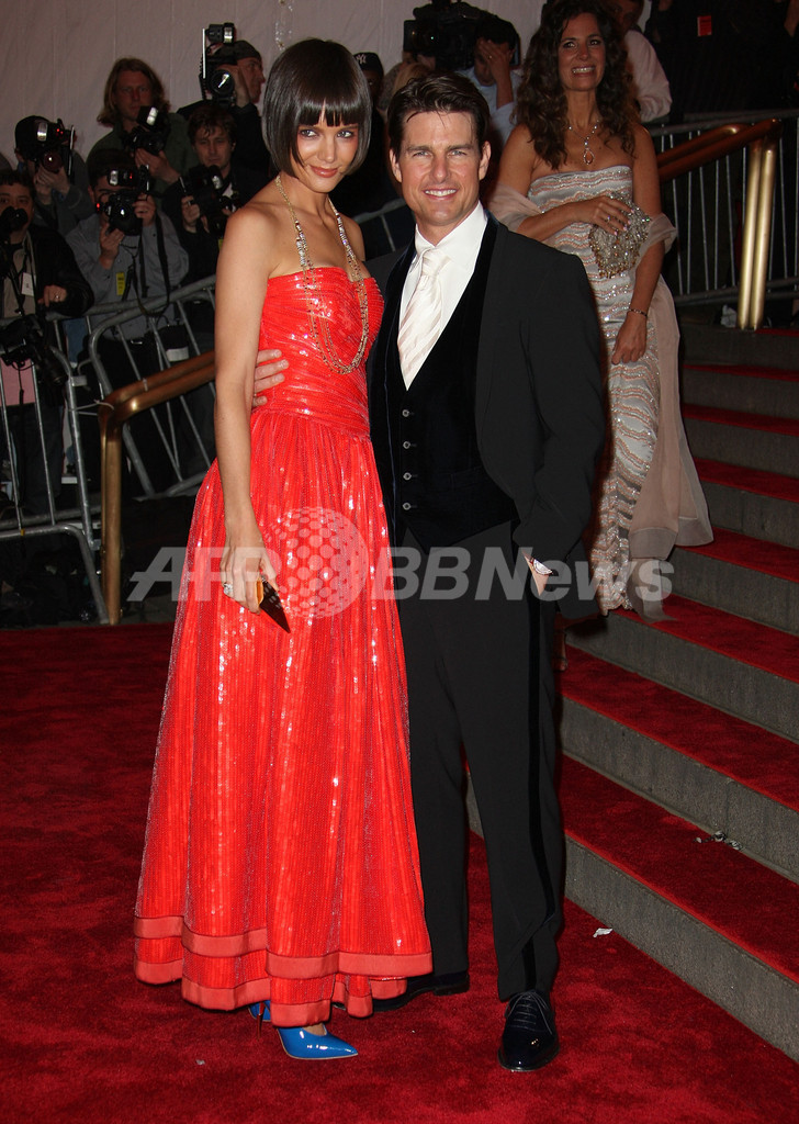 これに先駆け5日、ガラパーティーが開かれ、女優のケイティ・ホームズ(Katie Holmes)と俳優のトム・クルーズ(Tom Cruise)夫妻が出席した。ケイティの赤いドレスとトムのスーツはジョルジオ・アルマーニ(Giorgio Armani)のもの。展覧会のテーマ“スーパーヒーロ”にあわせ、足下には鮮やかなブルーのシューズを合わせた。ジュエリーはブシュロン(Boucheron)。(c)MODE PRESS
