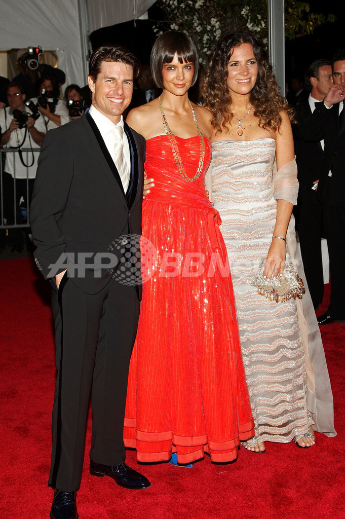 これに先駆け5日、ガラパーティーが開かれ、女優のケイティ・ホームズ(Katie Holmes)と俳優のトム・クルーズ(Tom Cruise)夫妻が出席した。ケイティの赤いドレスとトムのスーツはジョルジオ・アルマーニ(Giorgio Armani)のもの。展覧会のテーマ“スーパーヒーロ”にあわせ、足下には鮮やかなブルーのシューズを合わせた。ジュエリーはブシュロン(Boucheron)。(c)MODE PRESS