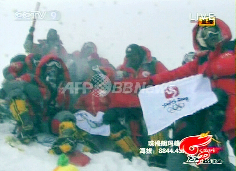 【5月8日 AFP】(一部更新、写真追加)北京五輪の聖火を手にした中国の登山隊が、現地時間8日午前9時すぎ(日本時間同10時すぎ)、エベレスト(Everest、標高8848メートル)山頂に到達した。国営テレビが報じた。登山隊は同午前2時(日本時間同午前3時)に登頂を開始、午前10時の到着を予定していた。
