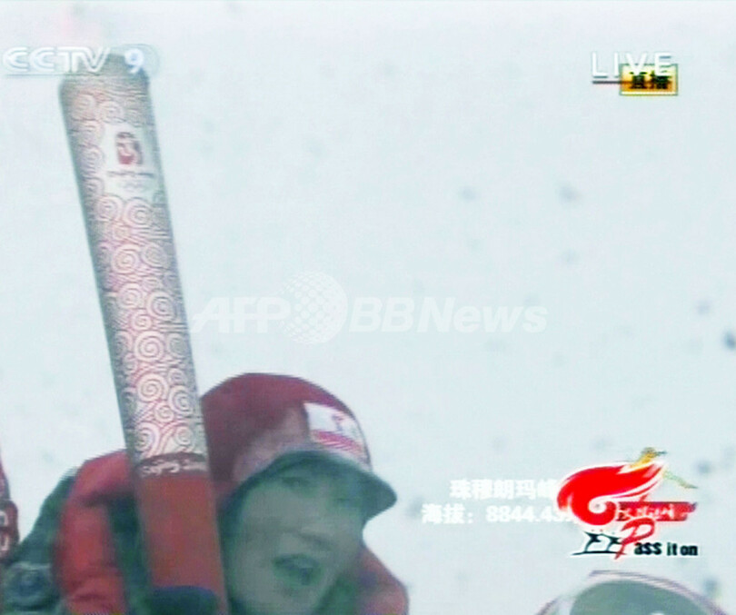 【5月8日 AFP】(一部更新、写真追加)北京五輪の聖火を手にした中国の登山隊が、現地時間8日午前9時すぎ(日本時間同10時すぎ)、エベレスト(Everest、標高8848メートル)山頂に到達した。国営テレビが報じた。登山隊は同午前2時(日本時間同午前3時)に登頂を開始、午前10時の到着を予定していた。