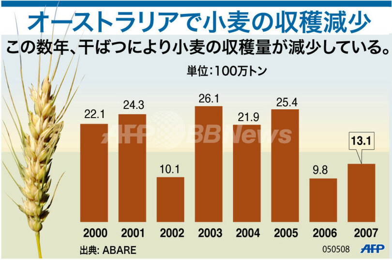 ニュース 政治・経済 図解 【図解】オーストラリアの小麦、収穫量減少 2008年5月10日 2:37 発信地:オーストラリア [ アジア・オセアニア オーストラリア ] このニュースをシェア (c)AFP 【5月10日 AFP】図は、オーストラリアの小麦の収穫量の推移を示したグラフ。(c)AFP<ニュース解説画像一覧へ> 政治・経済 一覧へ> メディア・報道関係・法人の方向け 写真・動画 購入のお問合せ>