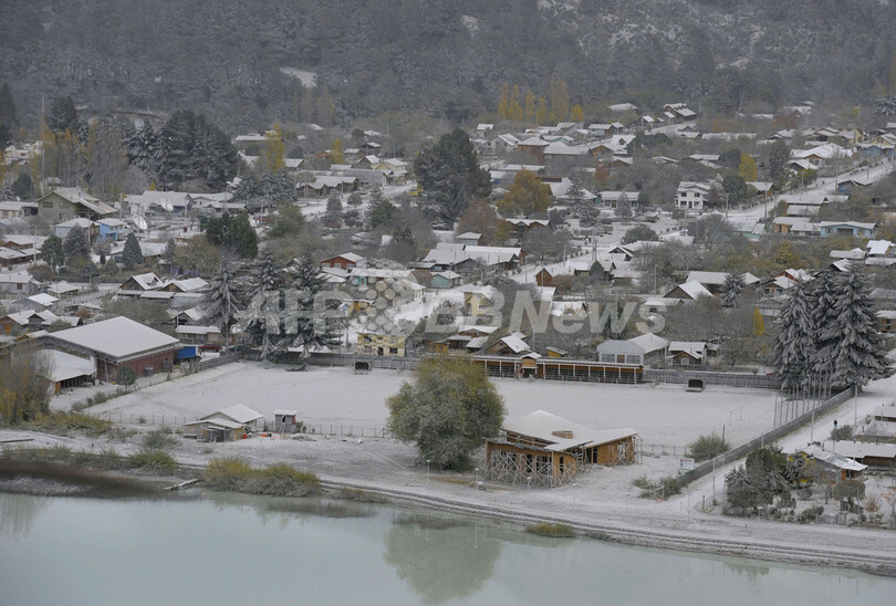数十キロ離れた場所でも風で運ばれた火山灰で空はかすみ、同火山から約70キロのフタレウフェ(Futaleufu)には火山灰が厚く降り積もっている。(c)AFP