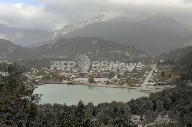 数十キロ離れた場所でも風で運ばれた火山灰で空はかすみ、同火山から約70キロのフタレウフェ(Futaleufu)には火山灰が厚く降り積もっている。(c)AFP