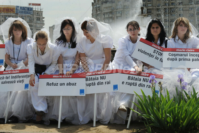 【5月12日 AFP】ルーマニアの首都ブカレスト(Bucharest)で地元の女性たちが8日、花嫁衣装を着て家庭内暴力に対する抗議活動を行った。
