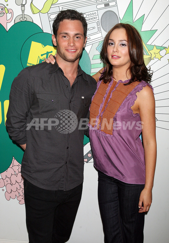 【5月14日 AFP】俳優のペン・バッジェリー(Penn Badgley)と女優のレイトン・ミースター(Leighton Meester)が13日、ニューヨーク(New York)のタイムズ・スクエア・スタジオ(Times Square Studios)で行われたMTVの音楽情報番組「Total Request Live」に出演した。(c)AFP/Getty Images