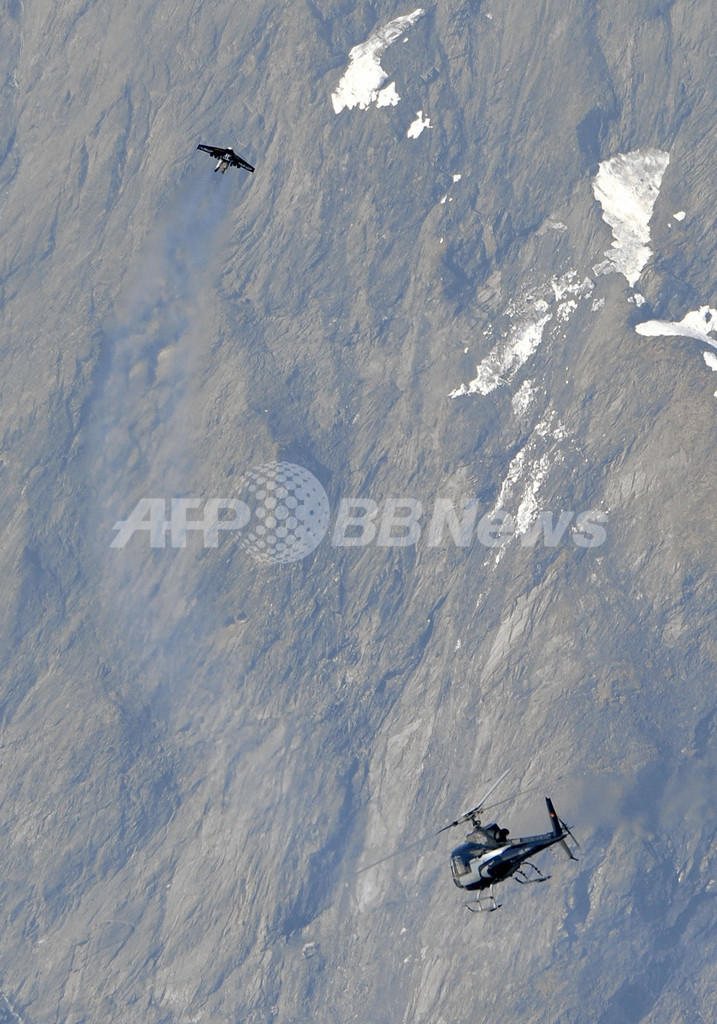 自称「フュージョンマン」ことYves Rossyさん(48)は14日、スイス西部の小さな町ベー(Bex)の上空2500メートルで、新しいカーボン製の翼を装着して飛行機から飛び立った。5分間飛行した後、パラシュートを開いて着陸した。