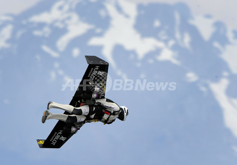 自称「フュージョンマン」ことYves Rossyさん(48)は14日、スイス西部の小さな町ベー(Bex)の上空2500メートルで、新しいカーボン製の翼を装着して飛行機から飛び立った。5分間飛行した後、パラシュートを開いて着陸した。