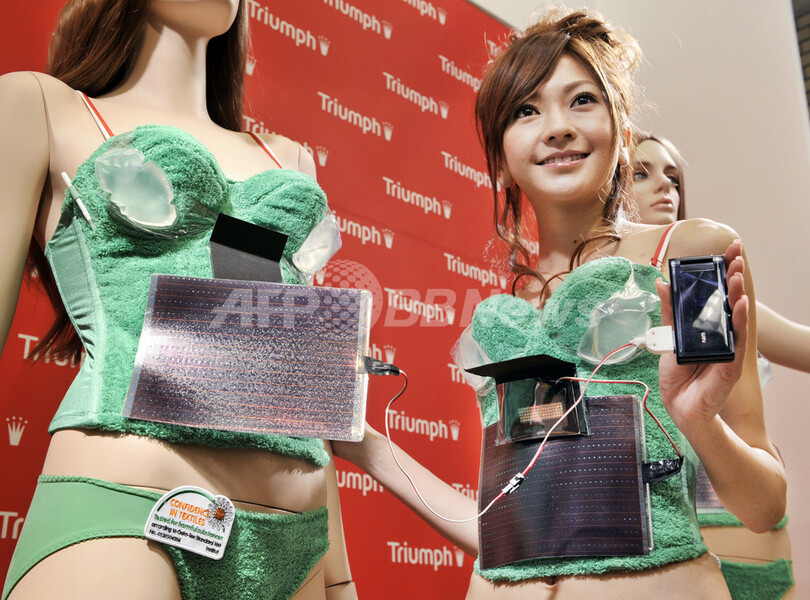 【5月15日 AFP】東京都内で14日、下着メーカーのトリンプ・インターナショナル・ジャパン(Triumph International Japan)が、地球温暖化などの環境問題への関心を高める目的で、「太陽光発電ブラ」(非売品)を発表し、2008年トリンプ・イメージガールの石田裕子(Yuko Ishida)がPRした。