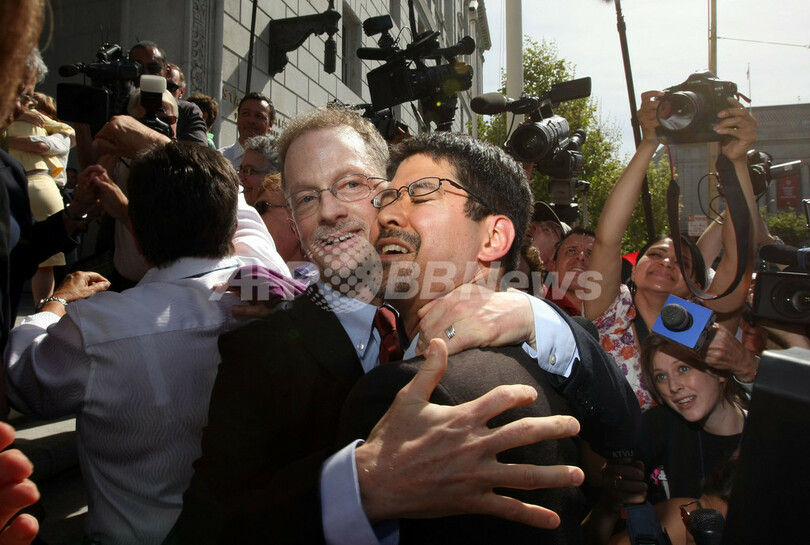 【5月16日 AFP】(一部訂正)米カリフォルニア(California)州最高裁判所は15日、婚姻を異性間に限った州法について、違憲との判決を下した。7人の陪審団は、州法の規定は差別に当たるとのサンフランシスコ(San Francisco)市と人権団体の主張を、4対3で支持した。