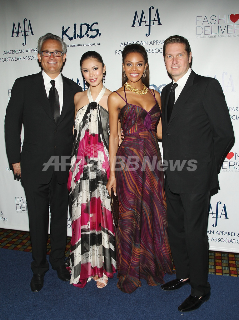 「2008 American Image Awards」会場に姿を見せた(左から)デザイナーのマーク・バッジェリー(Mark Badgley)、2007年ミス・ユニバース(Miss Universe 2007)世界大会優勝者の森理世(Riyo Mori)さん、「ミスUSA2008(Miss USA 2008)」のCrystle Stewartさん、デザイナーのジェイムス・ミシュカ(James Mischka、2008年5月14日撮影)。(c)AFP/Getty Images/Stephen Lovekin