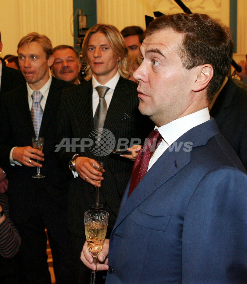 スポーツ サッカー メドベージェフ大統領がUEFA杯を制したゼニトを祝福 2008年5月17日 8:05 発信地:モスクワ/ロシア [ ロシア・CIS ロシア ] このニュースをシェア ‹ › ❮ 5/9 ❯ 首都モスクワ(Moscow)のクレムリン(Kremlin)で開催されたUEFA杯2007-08の祝勝会でゼニト・サンクトペテルブルクの選手と祝杯を挙げるドミトリー・メドベージェフ(%%Dmitry Medvedev%%)大統領。(2008年5月16日撮影)(c)AFP/YURI KADOBNOV 画像作成中 ! 【5月17日 AFP】14日に行われたサッカーUEFA杯2007-08(UEFA Cup 2007-08)の決勝戦でグラスゴー・レンジャーズ(Glasgow Rangers)を2-0で下し、優勝を果たしたゼニト・サンクトペテルブルク(Zenit St. Petersburg)の選手やスタッフは、16日に首都モスクワ(Moscow)のクレムリン(Kremlin)で開催された祝勝会に出席した。(c)AFP サッカー 一覧へ> メディア・報道関係・法人の方向け 写真・動画 購入のお問合せ>