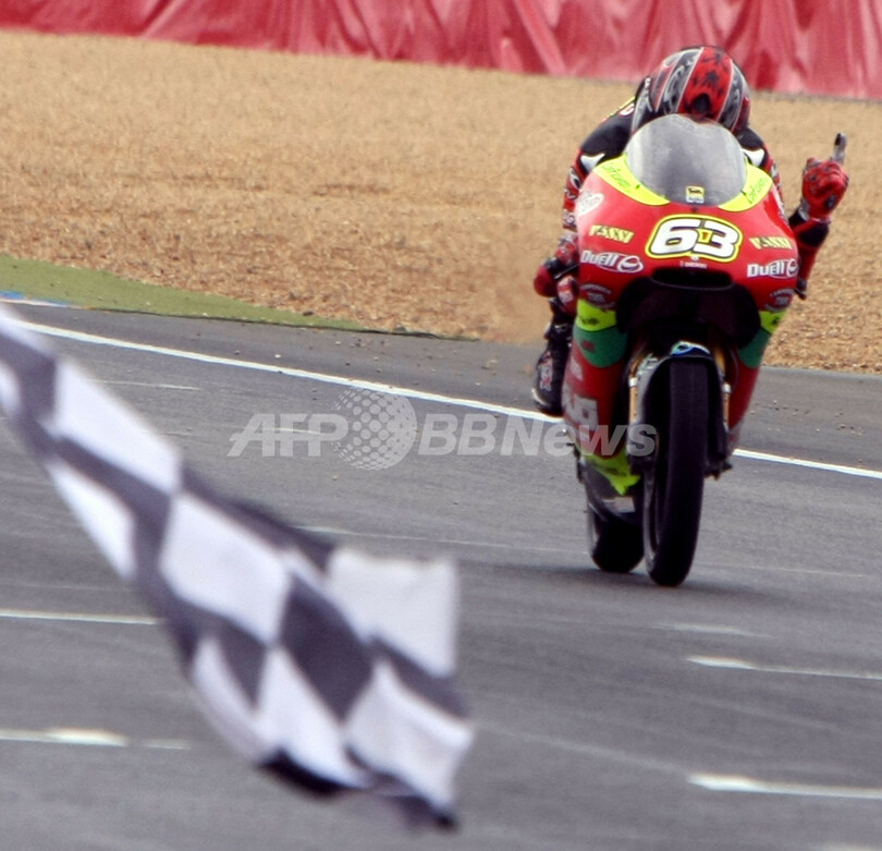 【5月18日 AFP】(写真追加)世界ロードレース選手権(WGP 2008)第5戦・フランスGP・125ccクラス決勝。アジョ・モータースポーツ(Ajo Motorsports)のマイク・ディ・メッリオ(Mike Di Meglio)は、10分08秒574を記録し優勝を果たした。