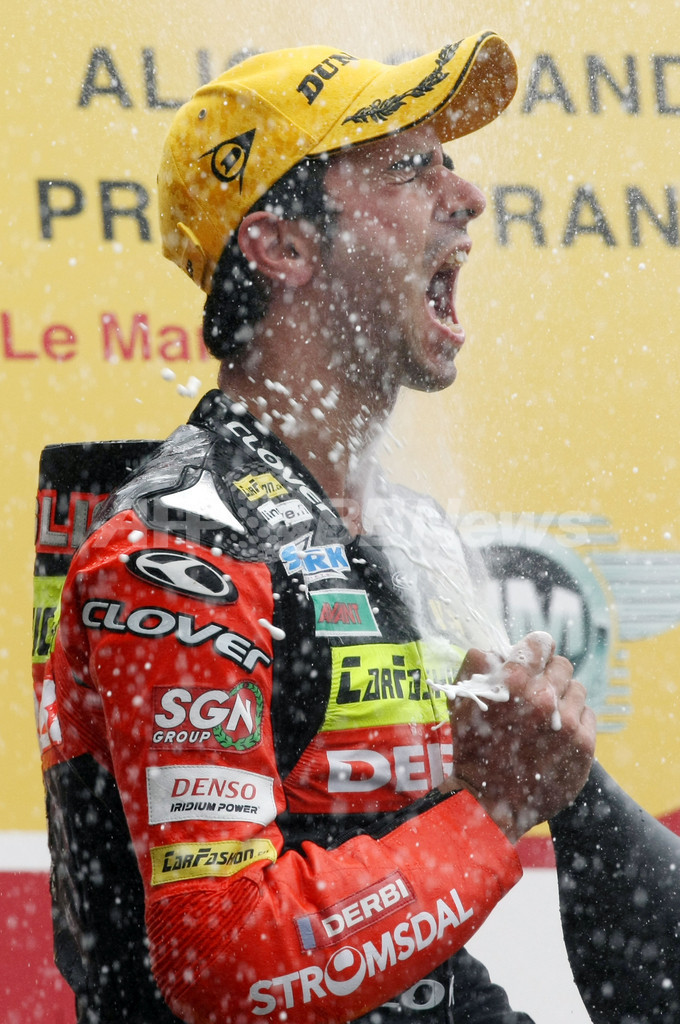 【5月18日 AFP】(写真追加)世界ロードレース選手権(WGP 2008)第5戦・フランスGP・125ccクラス決勝。アジョ・モータースポーツ(Ajo Motorsports)のマイク・ディ・メッリオ(Mike Di Meglio)は、10分08秒574を記録し優勝を果たした。