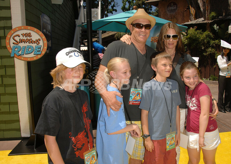 カリフォルニア(California)州ユニバーサル・シティ(Universal City)にあるユニバーサル・スタジオ(Universal Studios)で、新しくオープンしたアニメ「ザ・シンプソンズ(The Simpsons)」のアトラクションを見にきた俳優のコービン・バーンセン(Corbin Bernsen、左3)とアマンダ・ペイズ(Amanda Pays、(2008年5月17日撮影)。(c)AFP/Getty Images/Stephen Shugerman