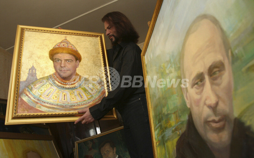 【5月21日 AFP】ロシア・サンクトペテルブルク(St. Petersburg)で19日、ロシア皇帝に扮(ふん)したドミトリー・メドベージェフ(Dmitry Medvedev)大統領を描いた「ツァー(ロシア皇帝)風ドミトリー」と題した作品を示すロシア人画家ワシリー・サプリキン(Vasily Saprykin)さん。