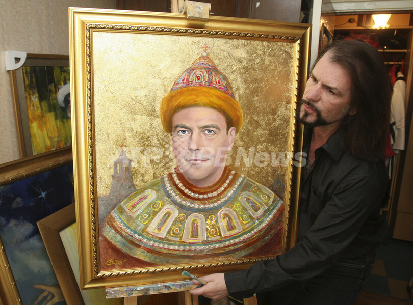 【5月21日 AFP】ロシア・サンクトペテルブルク(St. Petersburg)で19日、ロシア皇帝に扮(ふん)したドミトリー・メドベージェフ(Dmitry Medvedev)大統領を描いた「ツァー(ロシア皇帝)風ドミトリー」と題した作品を示すロシア人画家ワシリー・サプリキン(Vasily Saprykin)さん。