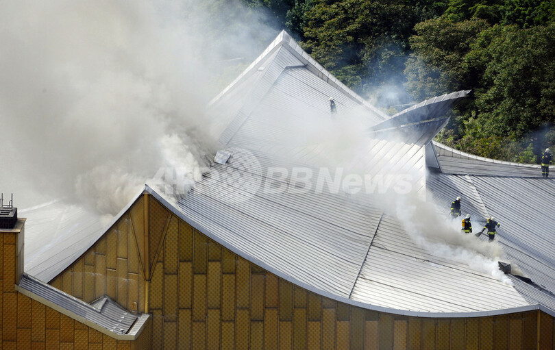 傾斜の付いた屋根から濃い煙が立ち上る中、約100人の消防隊が消火活動を行っている。消防当局によると、演奏者や聴衆は全員避難したという。