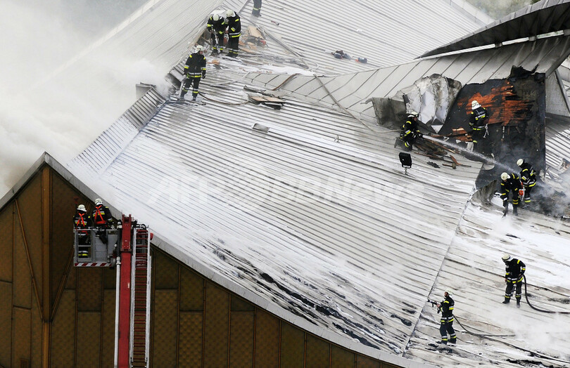 傾斜の付いた屋根から濃い煙が立ち上る中、約100人の消防隊が消火活動を行っている。消防当局によると、演奏者や聴衆は全員避難したという。