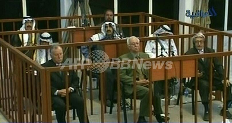 【5月21日 AFP】故サダム・フセイン(Saddam Hussein)元イラク大統領の側近で、外相なども務めたタレク・アジズ(Tareq Aziz)元副首相(72)の公判が20日、バグダッド(Baghdad)の米軍管理区域グリーンゾーン(Green Zone)内の高等法廷で始まった。元副首相は、1992年にバグダッドの商人42人を処刑したとして人道に対する罪で起訴されており、有罪が確定すると死刑判決が下される可能性がある。