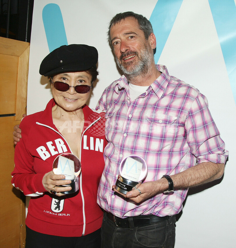 ニューヨーク(New York)のスポーツ施設チェルシー・ピア(Chelsea Piers)で開催されたエイズ支援のチャリティーイベント「Visual AIDS Strike II Benefit」に参加する(左から)アーティストのオノ・ヨーコ(Yoko Ono)、美術家のトニー・フェーエル(Tony Feher、2008年5月19日撮影)。(c)AFP/Getty Images/Stephen Lovekin