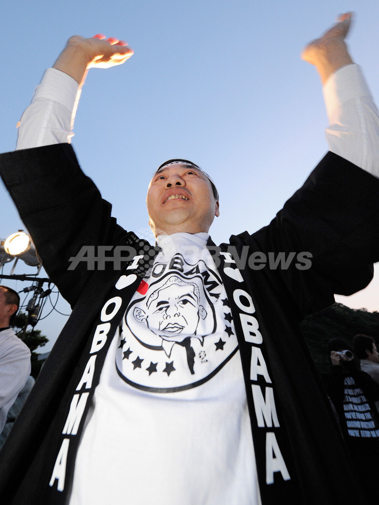 【5月22日 AFP】米国民主党の大統領候補者指名レースでバラク・オバマ(Barack Obama)上院議員を応援している福井県小浜市で21日、オバマ候補の事実上の「勝利宣言」を祝う集会が催された。
