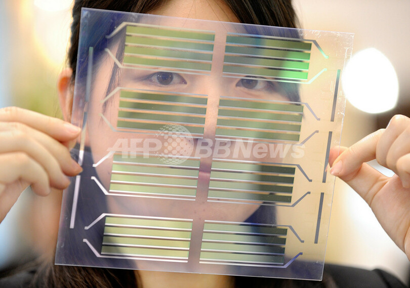 【5月23日 AFP】神戸市内で開催されている「環境フェア in KOBE」で、独立行政法人産業技術総合研究所(Advanced Industrial Science and Technology、AIST)は23日、産総研、トッキ(Tokki Corporation)、三菱商事(Mitsubishi Corporation)が共同で開発した次世代太陽電池モジュールの試作品を出展した。フラーレンとフタロシアニンが使用されている。(c)AFP