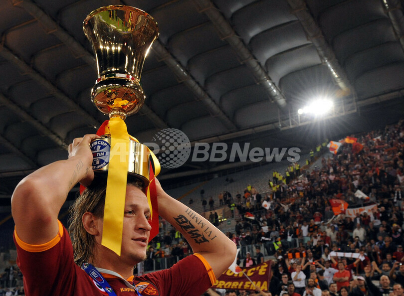 ローマの主将を務めるフランチェスコ・トッティ(Francesco Totti)は、負傷のため試合を欠場したにもかかわらず、イタリアのジョルジョ・ナポリターノ(Giorgio Napolitano)大統領から優勝トロフィーを受け取るために表彰台に上がった。(c)AFP