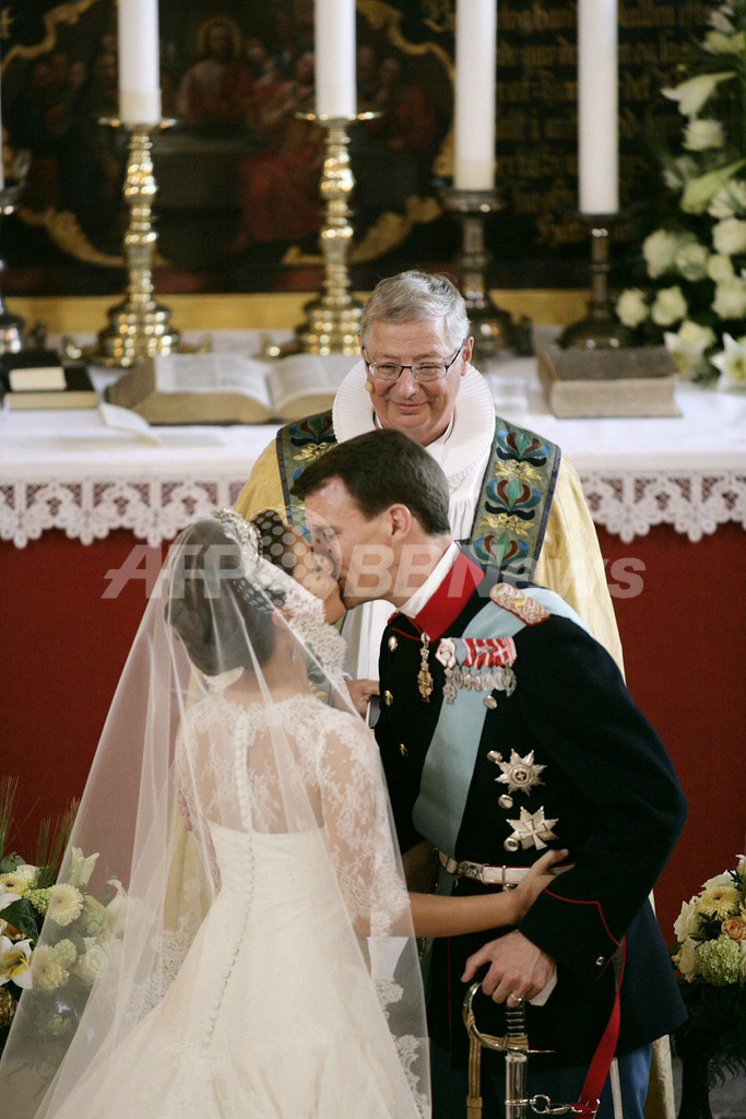 ユトランド半島南部の教会Mogeltonder Churchでの挙式で、マリー・カバリエ(Marie Cavallier)妃とキスをするヨアキム王子(Prince Joachim)。(2008年5月24日撮影)(c)AFP/Jens Noergaard Larsen
