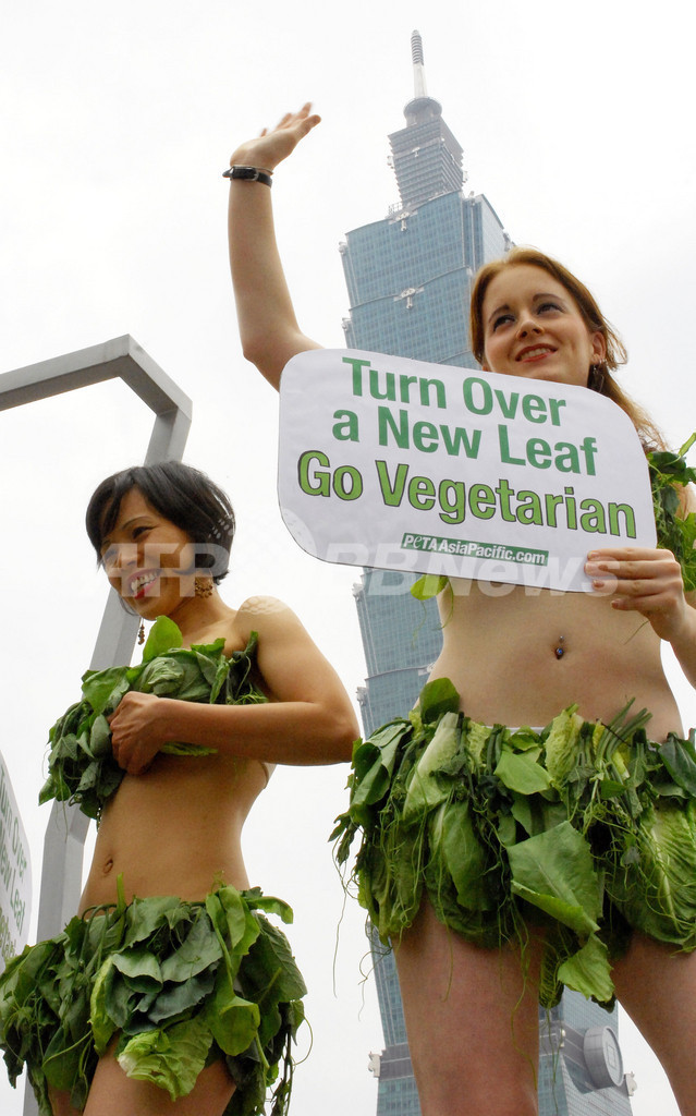 【5月25日 AFP】台湾・台北(Taipei)の高層ビル「台北101(Taipei 101)」前で22日、国際動物愛護団体「動物の倫理的扱いを求める人々の会(People for the Ethical Treatment of Animals、PETA)」の女性メンバー2人が野菜をモチーフにした衣装をまとい、通行人らにベジタリアンになるよう呼びかけた。19-25日の世界ベジタリアンウィーク(World Vegetarian Week)に合わせたもの。(c)AFP