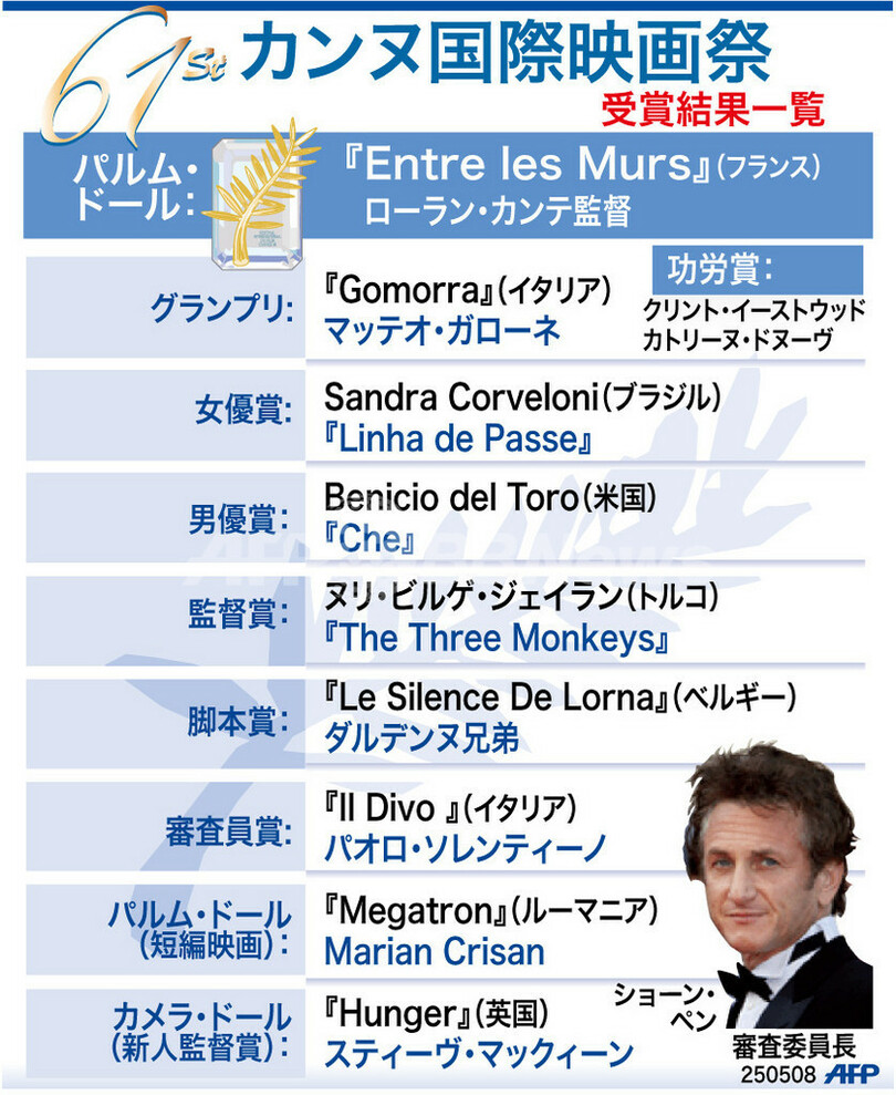 ニュース ライフ 【図解】第61回カンヌ国際映画祭、受賞結果一覧 2008年5月26日 10:42 発信地:カンヌ/フランス [ ヨーロッパ フランス ] このニュースをシェア (c)AFP 【5月26日 AFP】図は、第61回カンヌ国際映画祭(Cannes Film Festival)の受賞結果を示したもの。(c)AFPカンヌ国際映画祭の公式ウェブサイト(英語)<第61回カンヌ国際映画祭動画一覧へ><ニュース解説画像一覧へ> ライフ 一覧へ> メディア・報道関係・法人の方向け 写真・動画 購入のお問合せ>
