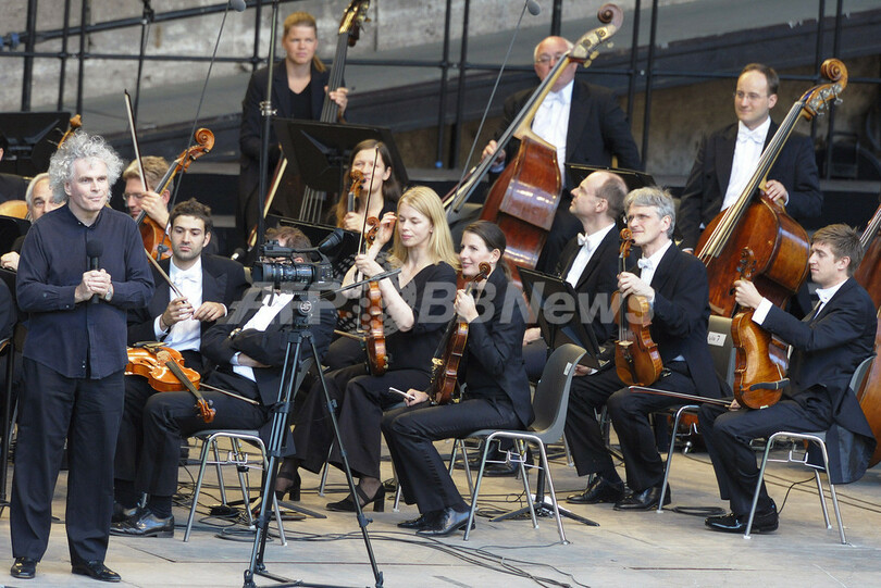 ベルリン(Berlin)の野外ステージ、ヴァルトビューネ(Waldbuehne)で行われた同コンサートには、フィルハーモニーの消火にあたった消防士らも招待された。(c)AFP/DDP