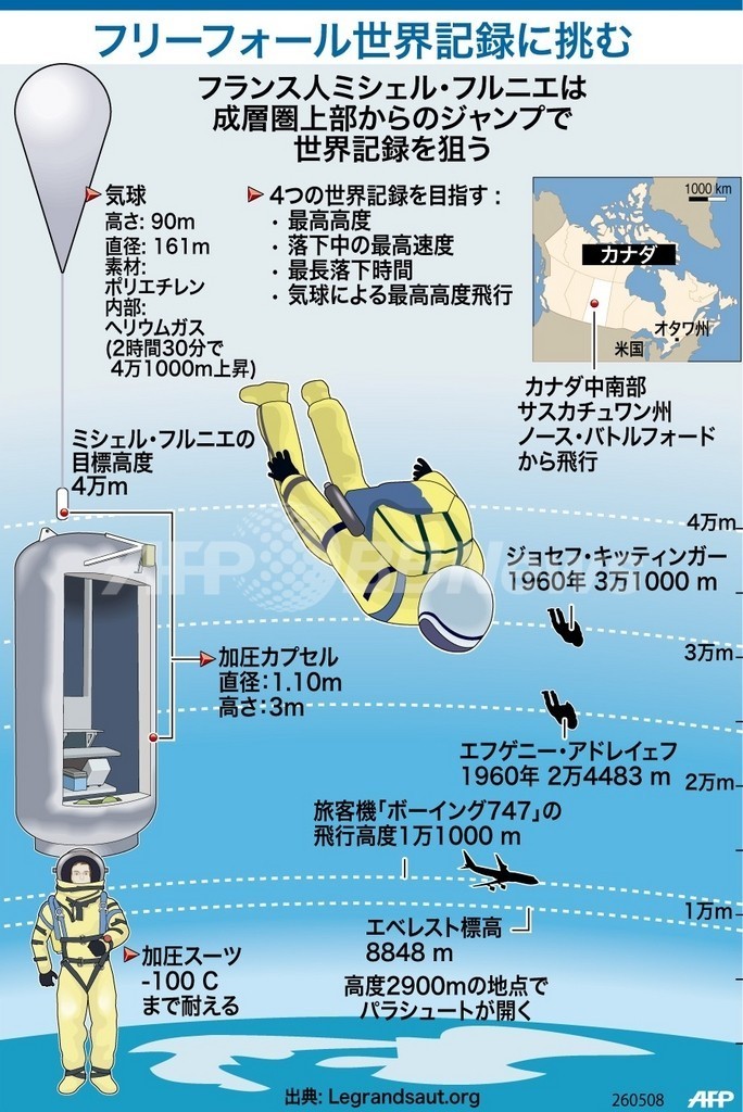 ニュース ライフ 図解 【図解】フランス人スカイダイバー、4つの世界記録を狙う 2008年5月27日 17:49 発信地:カナダ [ 北米 カナダ ] このニュースをシェア (c)AFP 【5月27日 AFP】図は、フリーフォールで世界記録更新に挑むフランス人ミシェル・フルニエ(Michel Fournier)さんについて示したもの。(c)AFP<ニュース解説画像一覧へ> ライフ 一覧へ> メディア・報道関係・法人の方向け 写真・動画 購入のお問合せ>