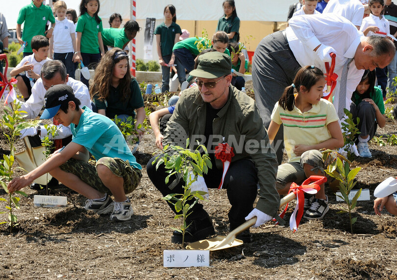 【5月28日 AFP】28日から横浜で開催される第4回アフリカ開発会議(Tokyo International Conference on African Development、TICAD)に出席するため来日したロックバンド「U2」のボーカル、ボノ(Bono)さんは27日、東京湾の埋め立て地で記念植樹を行った。