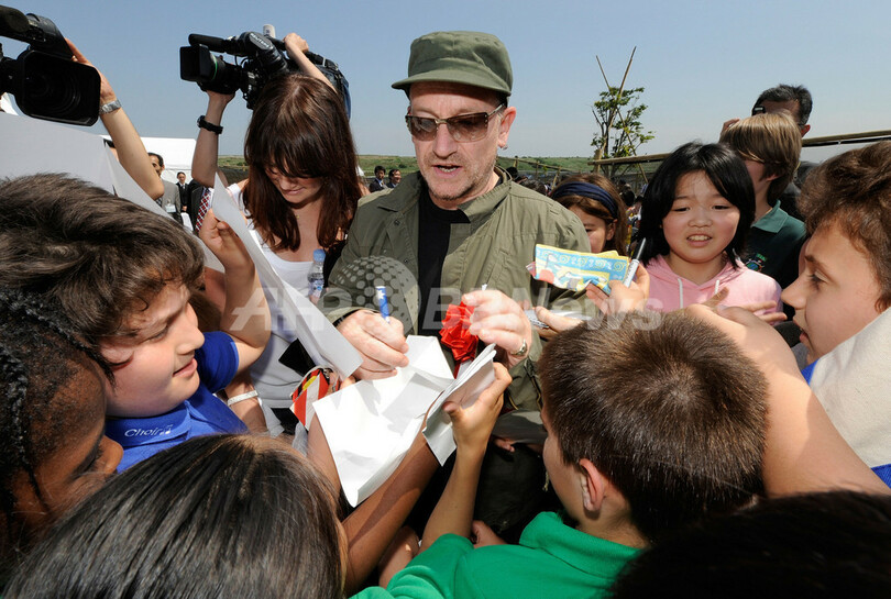 【5月28日 AFP】28日から横浜で開催される第4回アフリカ開発会議(Tokyo International Conference on African Development、TICAD)に出席するため来日したロックバンド「U2」のボーカル、ボノ(Bono)さんは27日、東京湾の埋め立て地で記念植樹を行った。