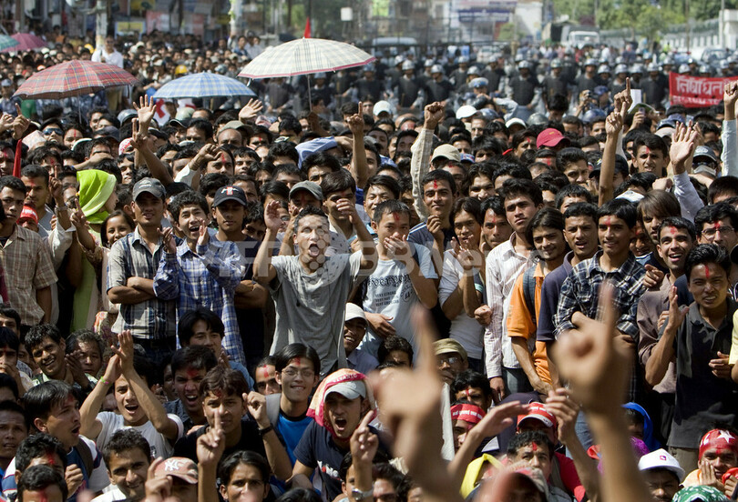 制憲議会周囲には、数千人の国王反対派がおしかけており、道路を埋め尽くした人々は「盗っ人ギャネンドラは国を去れ」などのスローガンを連呼している。