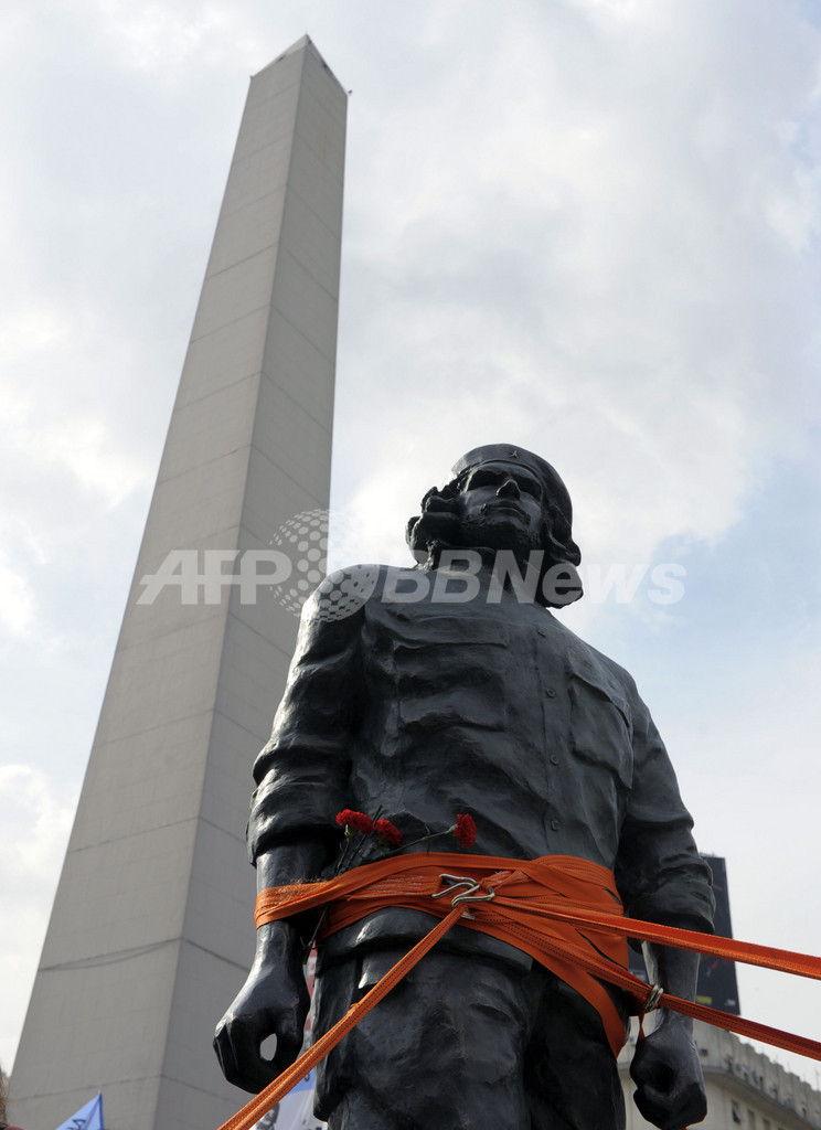【5月29日 AFP】アルゼンチン生まれの革命指導者エルネスト・チェ・ゲバラ(Ernesto "Che" Guevara)の銅像が27日、アルゼンチンの首都ブエノスアイレス(Buenos Aires)のオベリスコ(Obelisco)で公開された。彫刻家アンドレス・セルネリ(Andres Zerneri)さんによるこの銅像は重さ3トン。銅像はブエノスアイレスの北300キロメートルにあるゲバラのふるさと、ロサリオ(Rosario)まで船で運ばれ、ゲバラ生誕80周年を記念して6月1日に設置される。(c)AFP