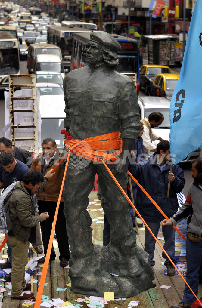 【5月29日 AFP】アルゼンチン生まれの革命指導者エルネスト・チェ・ゲバラ(Ernesto "Che" Guevara)の銅像が27日、アルゼンチンの首都ブエノスアイレス(Buenos Aires)のオベリスコ(Obelisco)で公開された。彫刻家アンドレス・セルネリ(Andres Zerneri)さんによるこの銅像は重さ3トン。銅像はブエノスアイレスの北300キロメートルにあるゲバラのふるさと、ロサリオ(Rosario)まで船で運ばれ、ゲバラ生誕80周年を記念して6月1日に設置される。(c)AFP