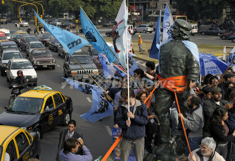 【5月29日 AFP】アルゼンチン生まれの革命指導者エルネスト・チェ・ゲバラ(Ernesto "Che" Guevara)の銅像が27日、アルゼンチンの首都ブエノスアイレス(Buenos Aires)のオベリスコ(Obelisco)で公開された。彫刻家アンドレス・セルネリ(Andres Zerneri)さんによるこの銅像は重さ3トン。銅像はブエノスアイレスの北300キロメートルにあるゲバラのふるさと、ロサリオ(Rosario)まで船で運ばれ、ゲバラ生誕80周年を記念して6月1日に設置される。(c)AFP