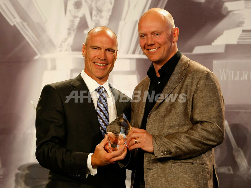 【5月29日 AFP】NHLは28日、ピッツバーグ(Pittsburgh)のオムニ ウィリアム・ペン・ホテル(Omni William Penn Hotel)で07-08シーズンの授賞式を開催し、ワシントン・キャピタルズ(Washington Capitals)のアレクサンダー・オベチキン(Alexander Ovechkin)が、レギュラーシーズン最高ポイント(ゴール数+アシスト数)を獲得した選手に贈られるアート・ロス記念賞(Art Ross Memorial Trophy)とレギュラーシーズン最多得点者に贈られるモーリス・ロケット・リシャール賞(Maurice Rocket Richard Trophy)をダブル受賞した。(c)AFP/Getty Images