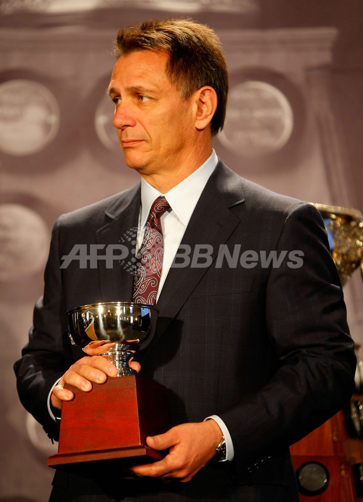 【5月29日 AFP】NHLは28日、ピッツバーグ(Pittsburgh)のオムニ ウィリアム・ペン・ホテル(Omni William Penn Hotel)で07-08シーズンの授賞式を開催し、ワシントン・キャピタルズ(Washington Capitals)のアレクサンダー・オベチキン(Alexander Ovechkin)が、レギュラーシーズン最高ポイント(ゴール数+アシスト数)を獲得した選手に贈られるアート・ロス記念賞(Art Ross Memorial Trophy)とレギュラーシーズン最多得点者に贈られるモーリス・ロケット・リシャール賞(Maurice Rocket Richard Trophy)をダブル受賞した。(c)AFP/Getty Images