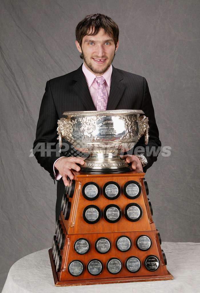 【5月29日 AFP】NHLは28日、ピッツバーグ(Pittsburgh)のオムニ ウィリアム・ペン・ホテル(Omni William Penn Hotel)で07-08シーズンの授賞式を開催し、ワシントン・キャピタルズ(Washington Capitals)のアレクサンダー・オベチキン(Alexander Ovechkin)が、レギュラーシーズン最高ポイント(ゴール数+アシスト数)を獲得した選手に贈られるアート・ロス記念賞(Art Ross Memorial Trophy)とレギュラーシーズン最多得点者に贈られるモーリス・ロケット・リシャール賞(Maurice Rocket Richard Trophy)をダブル受賞した。(c)AFP/Getty Images