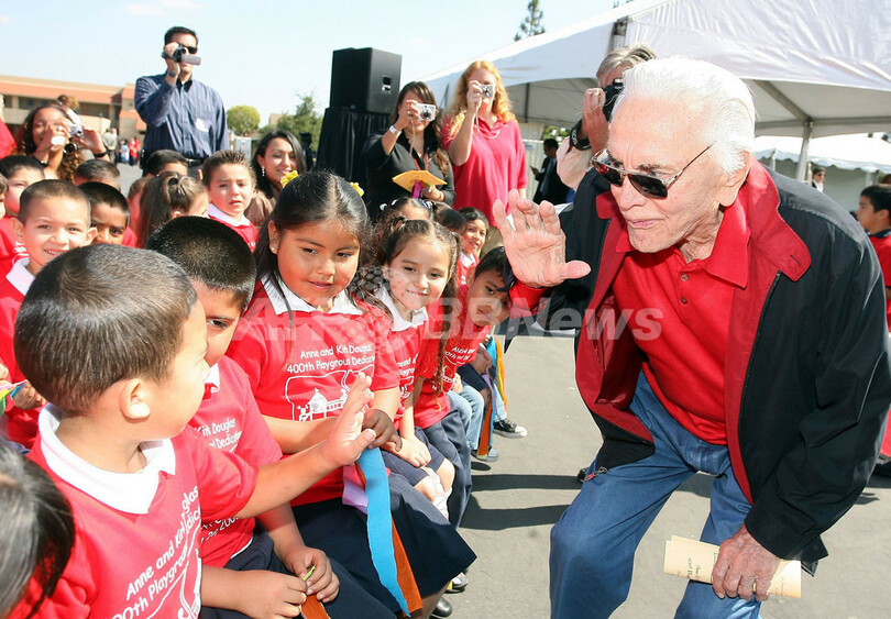 【5月29日 AFP】俳優カーク・ダグラス(Kirk Douglas)と妻のAnneさんが、ロサンゼルス(Los Angeles)のリリアン・ストリート小学校(Lillian Street Elementary School)に遊び場「Anne and Kirk Douglas 400th Playground」を寄贈した。