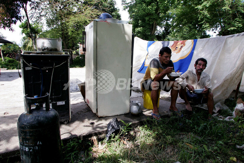 コロンビアのクンディナマルカ(Cundinamarca)県Puerto Salgarで、2か月におよぶ長雨による洪水を逃れ、避難先で食事をする男性ら(2008年5月28日撮影)。(c)AFP/Mauricio DUENAS