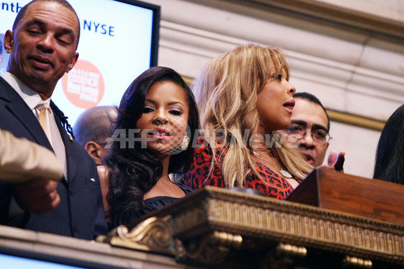 ニューヨーク証券取引所(New York Stock Exchange、NYSE)で取引開始のベルを鳴らす、歌手・女優のアシャンティ(Ashanti、左2、2008年6月3日撮影)。(c)AFP/Getty Images/Andrew H. Walker