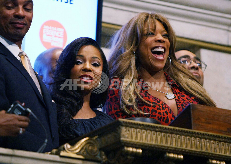 ニューヨーク証券取引所(New York Stock Exchange、NYSE)で取引開始のベルを鳴らす、歌手・女優のアシャンティ(Ashanti、左2、2008年6月3日撮影)。(c)AFP/Getty Images/Andrew H. Walker